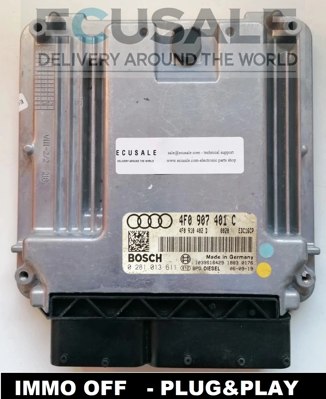 Centralina de motor Bosch com os números 0281013611 e 4F0907401C (equivalente 4F0910402D) preparada em modo IMMO OFF. Versão Plug&Play – instala e liga o carro sem adaptação do imobilizador.